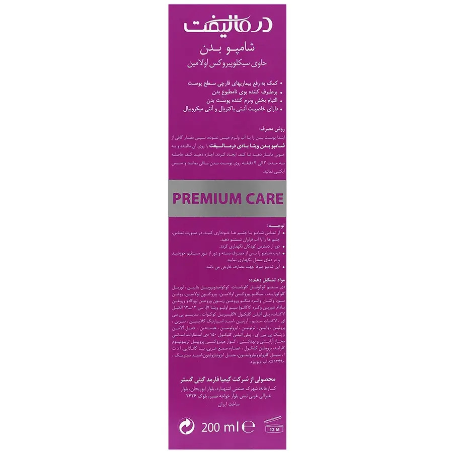 شامپو بدن ضد قارچ درمالیفت یک شوینده تخصصی برای برطرف کردن قارچ‌های سطحی پوست، کاهش بوی نامطبوع بدن و حفظ سلامت و نرمی پوست است. این محصول با فرمولاسیون ملایم و فاقد سولفات، نمک و پارابن طراحی شده و انتخابی ایده‌آل برای مراقبت روزانه پوست محسوب می‌شود.به کمک ترکیبات ضد قارچی قدرتمند مانند سیکلو پیروکس اولامین و پیروکتون اولامین، این شامپو رشد قارچ‌های پوستی را مهار کرده و هم‌زمان التهاب و خارش ناشی از آن‌ها را کاهش می‌دهد. روغن‌های گیاهی مغذی همچون زیتون، آووکادو، بادام شیرین، سویا و کتان نیز پوست را عمیقاً آبرسانی و تغذیه می‌کنند و با خاصیت آنتی‌اکسیدانی خود از آسیب‌های محیطی جلوگیری می‌نمایند.