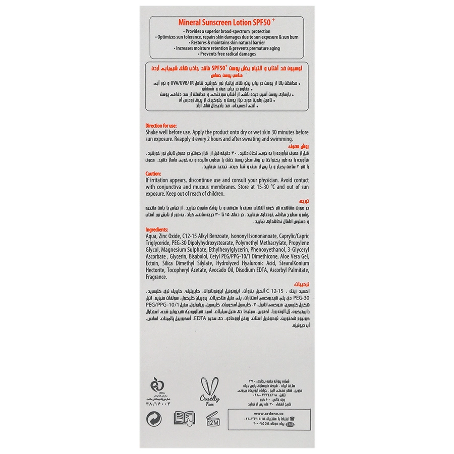 خیر. برخلاف بسیاری از ضدآفتابهای مینرال، بافت سبک و لوسیونی این محصول بهسرعت جذب پوست میشود و اثری از سفیدی، چسبندگی یا چربی روی پوست باقی نمیگذارد.