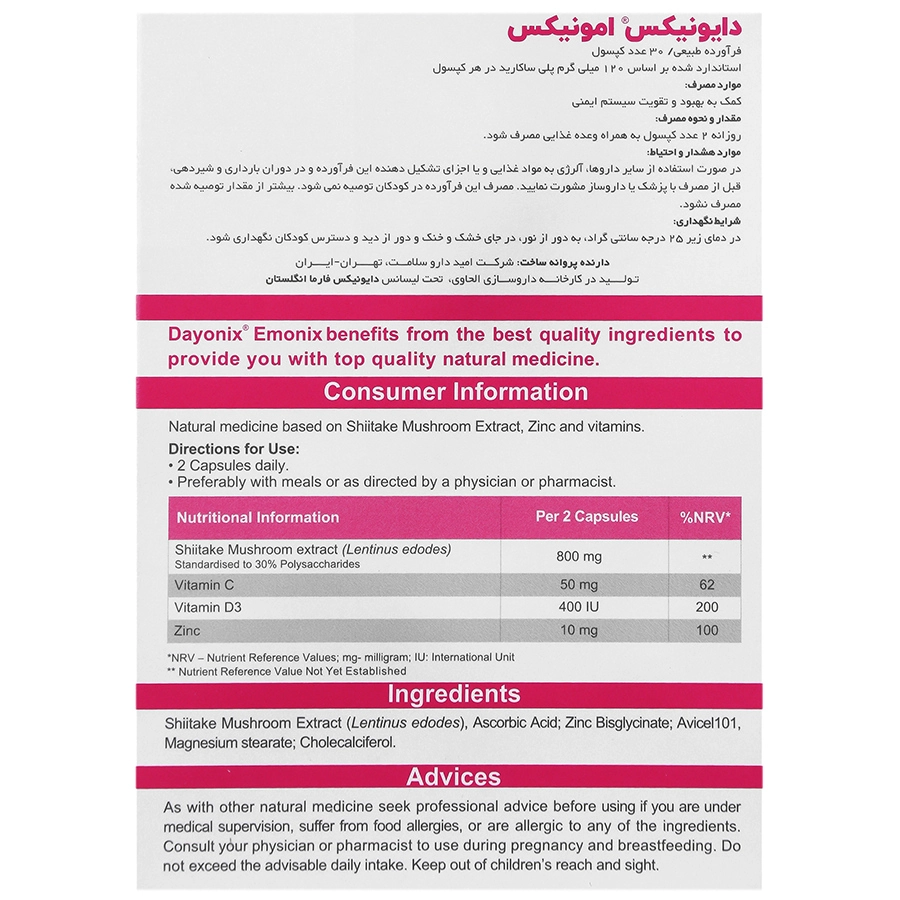 دایونیکس امونیکس (Dayonix Amunix) یکی از مکملهای تقویتی تخصصی برند اروپایی دایونیکس فارما (Dayonix Pharma) است که با هدف افزایش مقاومت بدن در برابر بیماریها، کاهش خستگی و تقویت سیستم ایمنی طراحی شده است. ترکیب علمی این محصول شامل عصاره قارچ شیتاکه، ویتامین D3، ویتامین C و زینک (روی) است که با اثر همافزای خود، عملکرد ایمنی بدن را بهطور مؤثر بهبود میبخشند.