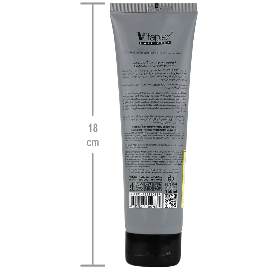 کرم ترمیمکننده موی کراتینشده ویتاپلکس با فرمولاسیون تخصصی حاوی کراتین هیدرولیزه، Mirustyle® MFP PEI، بیوتین و دکسپانتنول طراحی شده است تا موهای کراتینشده را تقویت، آبرسانی و از وز و خشکی محافظت کند.این محصول سبک، فاقد سولفات، پارابن و نمک است و بدون نیاز به آبکشی، باعث نرمی، درخشندگی و افزایش ماندگاری صافی مو میشود.