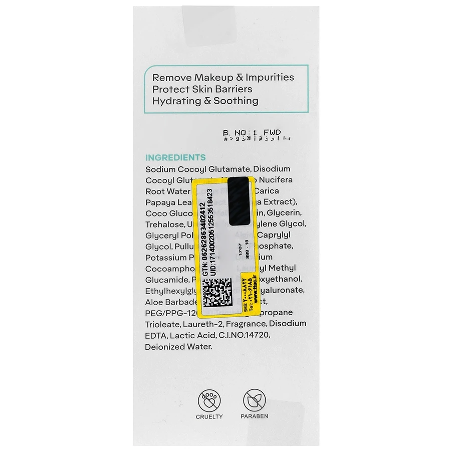 فرمولاسیون این محصول سرشار از ترکیبات ارزشمند و مؤثر است. عصاره نیلوفر آبی با خاصیت آبرسانی قوی، رطوبت پوست را در طول روز حفظ کرده و از تبخیر رطوبت جلوگیری میکند. عصاره پاپایا که غنی از آنتیاکسیدانهای طبیعی است، به بهبود قابلیت ارتجاعی پوست کمک کرده و ظاهر خسته یا بیروح آن را بهبود میبخشد. مالتودکسترین نیز بهعنوان نرمکنندهای ملایم، موجب نرمی و لطافت بیشتر پوست شده و آن را برای جذب بهتر محصولات بعد از شستشو مانند تونر، سرم و مرطوبکننده آماده میکند. این ترکیبات در کنار هم تجربهای متفاوت از پاکسازی همراه با مراقبت ارائه میدهند.