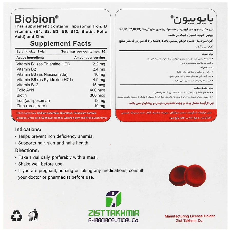 ویال بایوبیون یک مکمل غذایی است که حاوی آهن لیپوزومال، ویتامینهای گروه B و زینک میباشد. این مکمل برای پیشگیری و درمان کمخونی فقر آهن، تقویت سیستم ایمنی و افزایش انرژی روزانه طراحی شده است. همچنین به سلامت پوست، مو و ناخنها کمک میکند و از خستگی و ضعف ناشی از کمبود آهن جلوگیری مینماید.