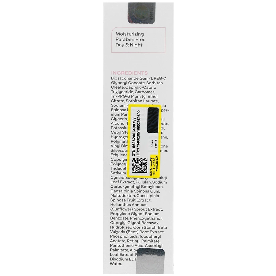 بیوساکارید گام-۱، پی ای جی ۷ گلیسریل کوکوات، سوربیتان اولئات، کاپریلیک کاپریک تری گلیسیرید، کربومر، تری- پی پی جی ۳ میریستیل اتر سیترات، سوربیتان لورات، سدیم هیالورونات، روغن آرگان، شی باتر، گلیسیرین، ستیل الکل، ایزو ستئاریل ایزو استئارات، پتاسیم ستیل فسفات، ستیل استئارات، استئاریک اسید، هیدروژنیتد پلی ایزوبوتن، پلی متیل سیلوکسان، وینیل دایمتیکون/ متیکون سیلوکسان کراس پلیمر، اتیلن/ پروپیلن کوپلیمر، لیپیدیوم ساتیوم اسپروت اکسترکت و سینارا اسکولیموس (عصاره آرتیشو) لیف اکسترکت و پولولان و سدیم کربوکسی متیل بتا گلوکان و کاسالپینا اسپینوساکام و مالتودکسترین، کاسالپنیا اسپینوسا فروت اکسترکت و هلیانتوس آئوس (عصاره گل آفتابگردان) و پروپیلن گلیکول و فنوکسی اتانول و سدیم بنزوات، سدیم پلی آکریلات، روغن پارافین، تری دست-8، فنوکسی اتانول، کاپریلیل گلیکول، بیزوکس، عصاره نشاسته ذرت هیدرولیز شده، عصاره ریشه چغندر قرمز، فسفولیپیدز، توکوفریل استات، رتینیل پالمیتات، پانتوتنیک اسید، آسکوربیل پالمیتات، کولکالسیفرول، عصاره آلوئه ورا، اسانس مجاز آرایشی و بهداشتی، دی سدیم ا. د. ت. آ، آب دیونیزه.