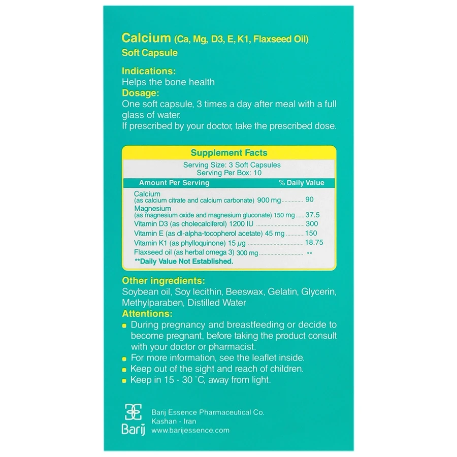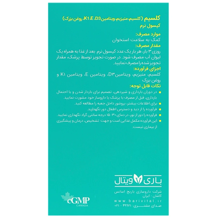همچنین وجود منیزیم و امگا ۳ در فرمولاسیون کلسیم باریویتال میتواند به بهبود عملکرد عضلات، کاهش درد و التهاب کمک کند و این مکمل را به گزینهای مناسب برای مصرف روزانه افراد در معرض کمبود کلسیم تبدیل نماید. کپسول کلسیم باریویتال در قوطیهای پلاستیکی ۳۰ عددی و توسط شرکت باریج اسانس در ایران تولید میشود و در دسته مکملهای کاربردی برای سلامت استخوان قرار میگیرد.