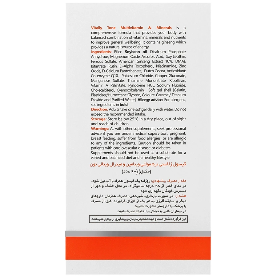 مولتی ویتامین ویتالی تون به فرم سافتژل تولید شده است که جذب مناسبی دارد و برای مصرف روزانه بانوان و آقایان بزرگسال قابل استفاده است. بر اساس مقالات Healthline، مصرف منظم مولتیویتامینها در افرادی که دریافت کافی ریزمغذیها از رژیم غذایی ندارند، میتواند به بهبود سطح انرژی، کاهش احساس خستگی و حمایت از عملکرد طبیعی بدن کمک کند.