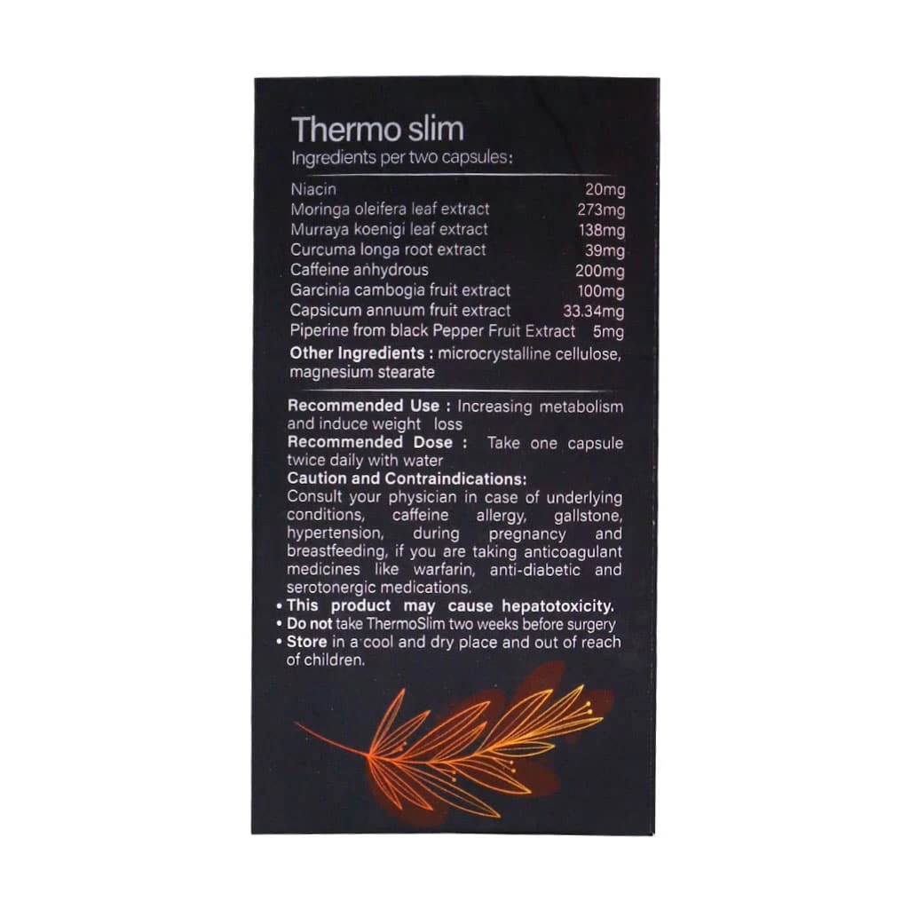 ترمواسلیم یک مکمل طبیعی کاهش وزن است که از ترکیب ۶ عصاره گیاهی مؤثر شامل گارسینیا کامبوجیا، زردچوبه، مورینگا، فلفل دلمهای، فلفل سیاه و کاری، بههمراه کافئین و ویتامین B3 (نیاسین) فرموله شده است. این ترکیب هدفمند، یک فرمول چندمسیره را برای کمک به کاهش وزن سالم و اصولی فراهم میکند.