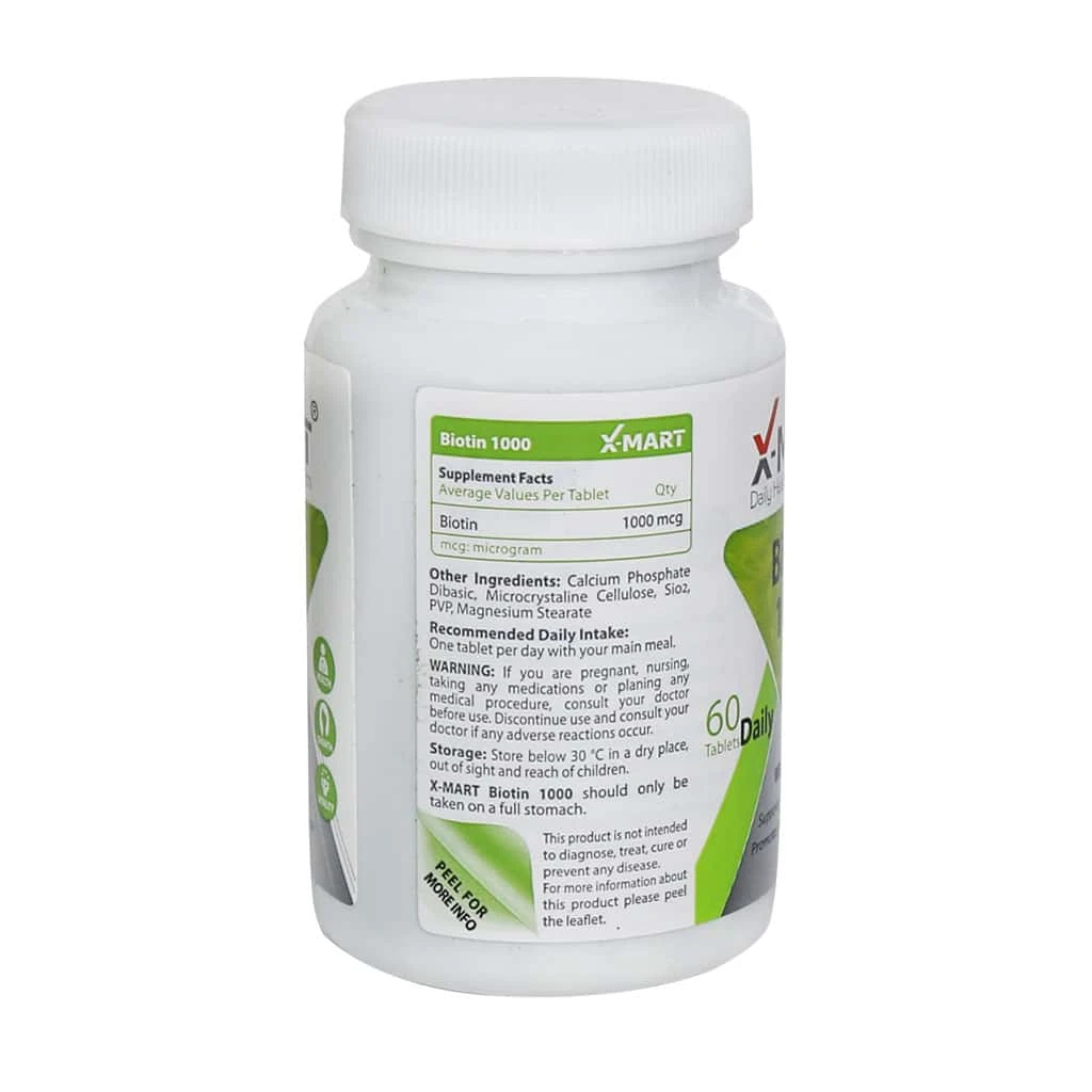 قرص بیوتین 1000 ایکس مارت یک مکمل تخصصی برای تقویت مو، کاهش ریزش مو، افزایش ضخامت مو و استحکام ناخنها است که توسط شرکت نیکان فارمد مهر تولید میشود. این محصول حاوی ۱ میلیگرم بیوتین (ویتامین B7) در هر قرص بوده و فاقد گلوتن و GMO است.