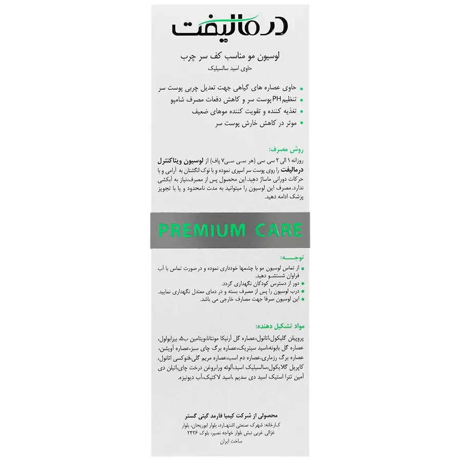 لوسیون کف سر چرب درمالیفت مدل Vitacontrol یک محصول تخصصی برای افرادی است که از چربی زیاد پوست سر، شورههای مقاوم، خارش و ریزش مو رنج میبرند. این لوسیون با بهرهگیری از ترکیبات گیاهی، ضد قارچ و آنتیاکسیدانها به صورت موثر چربی پوست سر را کنترل کرده، منافذ را پاکسازی میکند و به تقویت فولیکولهای مو کمک میکند.
